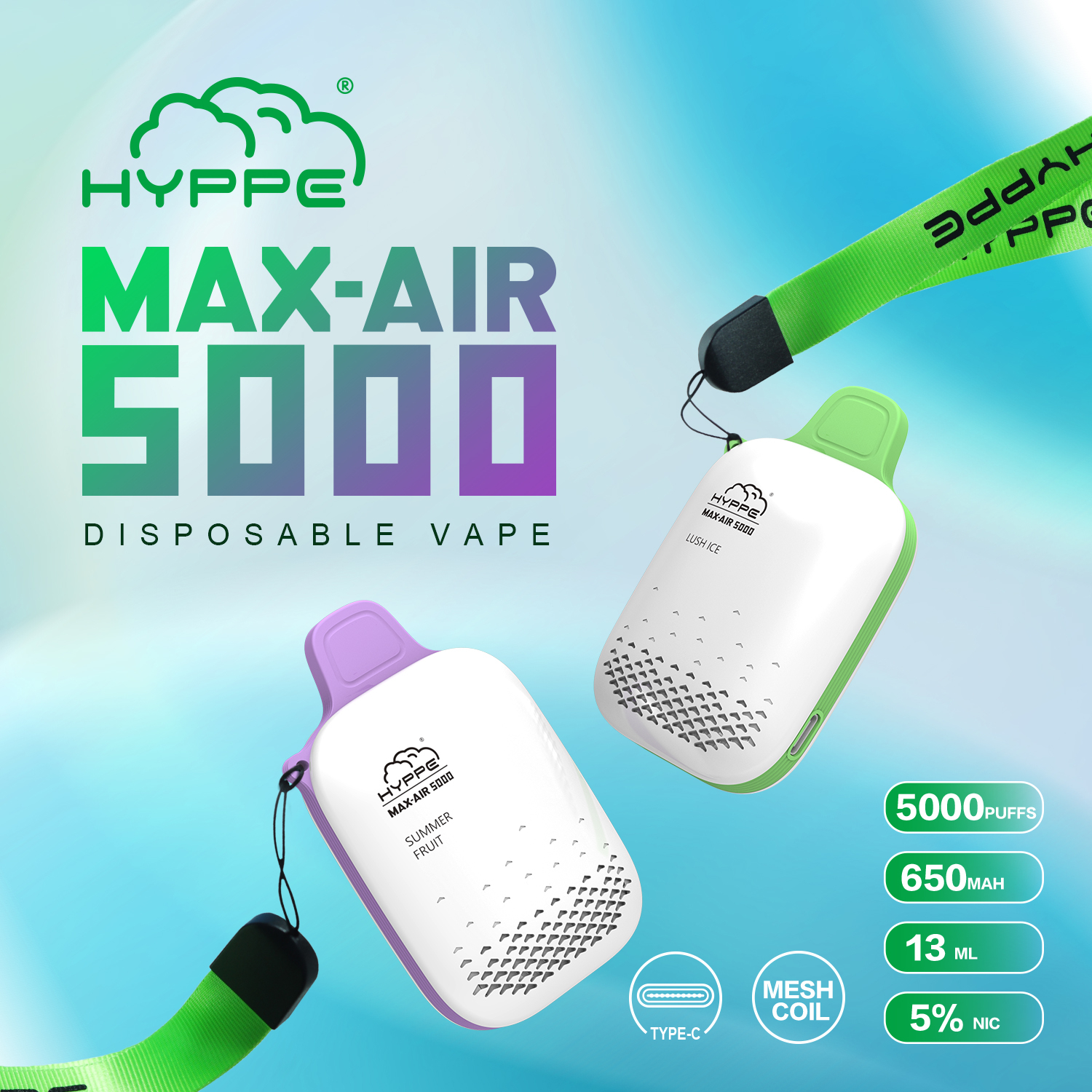 What are Hyppe Max Air Disposables? The Hyppe Max Air Disposable Vape is a premium vape device that is absolutely stunning in every way. From its unique body that is dazzled with appeal to the performance-driven mesh coil that is all about vapor and flavor output, the Max Air Disposable is definitely worth its weight in words. The device looks stunning, boasting a compact structure, comfortable mouthpiece, and an included lanyard to never lose sight of your device again. It has a USB Type-C charging port for fast charging. Integrated into the device is a 650mAh recharged battery and a 13mL vape juice capacity using 50mg salt nicotine. It earns up to 5000 puffs per unit. Inside the cartridge, there is a performance-driven mesh coil as well, providing the best flavor and vapor output.